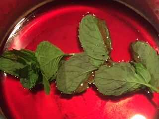 La gota en la ramita de menta y las rejillas de jengibre es decir los ingredientes restantes y cortezas de limón.