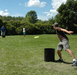 ahora a buscar socios (2 vs 2) y les están en lados diferentes. luego tomar un frizbee y tirarlo todo y tratar de hacer en la ranura. Si hace en la raja entonces usted gana. Si la haces en la parte superior que ganan pero la otra persona tiene la oportunidad de atar. Si usted golpea el lado vale 2 puntos. (juegas a 21) aquí está el giro que su pareja puede golpear el frizbee a o en el cañón. Si golpea en la parte exterior del barril vale 1 punto si golpeó en la parte superior del barril vale 3 puntos. pero si llegan de alguna manera en la ranura frontal todavía ganar. Le tiran entonces lanza su pareja entonces es que girar los otros pueblos.