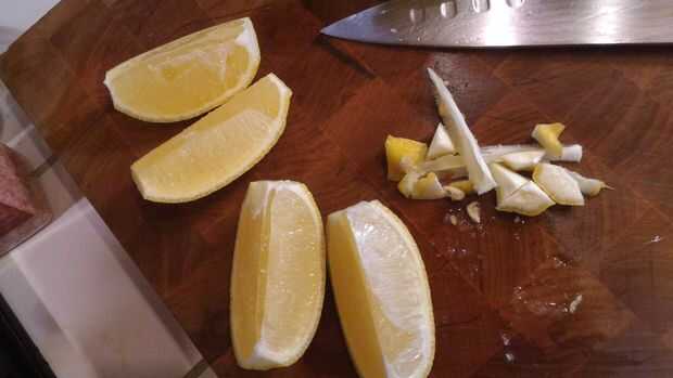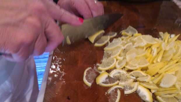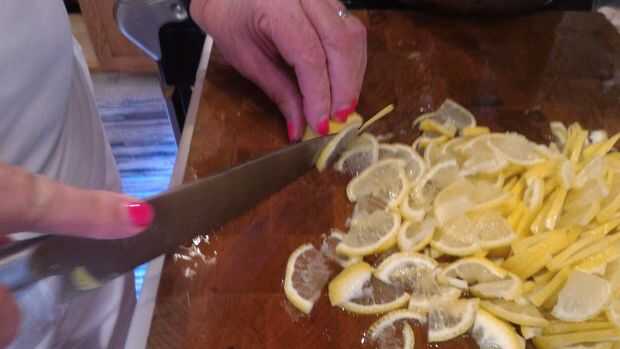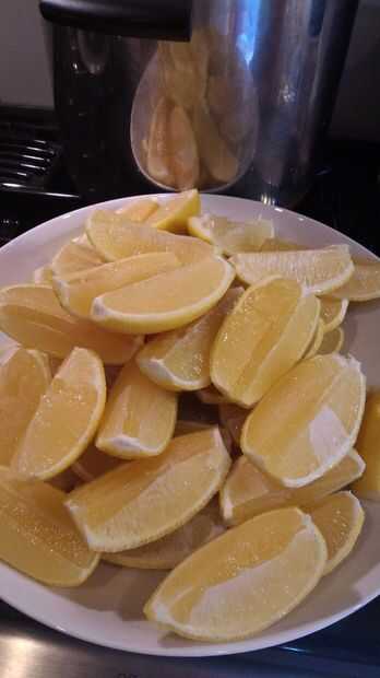 Comenzar con 10-12 limones (usé limones regulares, comprados a Costco en bolsa de 5#, puede utilizar limones Meyer. Cortar cada limón en cuartos; quitar todas las semillas y corteza blanca interior... GUARDAR aparte.