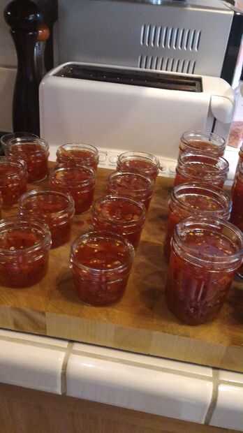 Llenar frascos de a 1/2 pulgada por debajo de la parte superior. Limpiarlos tapas de tarros. Poner las tapas y los bordes en tarros, apriete para garantizar; lugar en conservas olla haciendo que el agua es de 2 pulgadas por encima de todos los frascos; Llevar olla hasta hervir y cocer a fuego lento durante 10 minutos. Retire los tarros a estante para cool... tapas de verificación; todos los frascos deben "pop" que indica que han sellado. Si cualquier frascos "flexión" cuando presionas en el centro de la tapa, que esto significa que los frascos no han sellado--sencillamente aquellos en la nevera para comer, tenía unas sobras que no incomodan para sellar como sé que comeré esto.