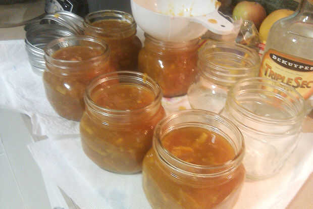 Use su cucharón para llenar cada frasco hasta dentro de 1/4 de pulgada en la parte superior de la llanta. Limpie los bordes. Si usando Triple-Sec, agregar apenas un chorrito en cada tarro no más de una cucharada cada uno, luego tapa y tornillo en las tapas apenas al cierre, pero no apriete. He escuchado que Gran Marnier funciona muy bien también.