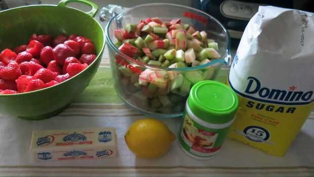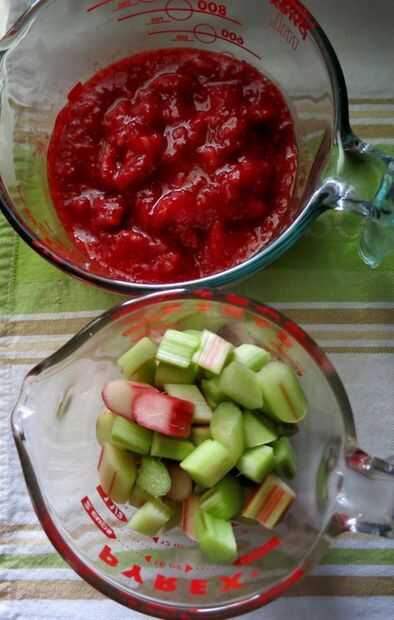 Lave las fresas y ruibarbo con fría agua, drenaje. Quite los tallos y las tapas de fresas. Aplastar una capa a la vez utilizando una trituradora de la patata (pulso varias veces en mi procesador de alimentos). Medir 2 tazas de fresas machacadas. Retire tapas de hojas y extremos de la raíz de ruibarbo. Cortar el ruibarbo en trozos de 1/2 pulgada. Medir 2 tazas de ruibarbo picado.