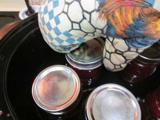 Procesar los frascos de mermelada en un baño de agua caliente durante unos 15 minutos (traiga a un hervor y hervir durante 15 minutos). Asegúrese de que el agua cubra sus frascos por lo menos 1/2 pulgada de agua. Porque tuve que añadir agua a la olla, dejé allí por cerca de 30 minutos en alto.