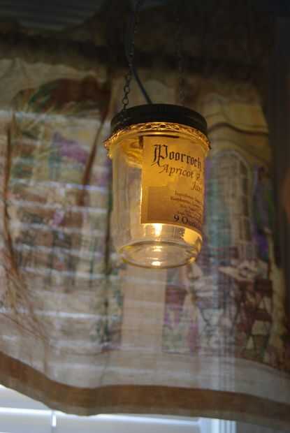 salvó mi tarro de mermelada que compré de los monjes en Eagle Harbor Michigan con la sociedad de San Juan.  Corren lo Jampot de mayo hasta al menos octubre, cuando estaba allí, venta de mermeladas y productos para ayudar a mantener el monasterio además de cualquiera necesita donaciones horneados.  Pongo una capa de esmalte sobre la etiqueta para mantenerlo como es porque me gustó la etiqueta.  Es un 9 oz tarro de conservas, pero se puede utilizar una versión más grande.  Tendría que ir a la tienda de hardware para más pesada cadena colgante.  He podido colgar este tamaño con una cadena de joyería de metales pesados muy bien.  Es tu opción para decorar la jarra de todos modos desea.  Podría pintarlo.  Usted podría esmalte con pegamento blanco mitad y mitad pintura acrílica liquidez que será transparente cuando se seca.  Prueba en algún vidrio antes de usarla para ver el efecto deseado.