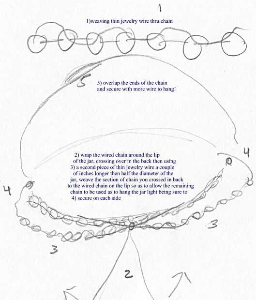 Usé 36" cadena encanto pesado para envolver alrededor del borde del tarro, apenas debajo del borde de la tapa, cruzaron la cadena y llevó ambas piezas a los lados, asegurándolo con alambre de la joyería fina. Por favor ver las fotos de la jarra de luz así como el esquema redactado para ayudar, pero parece un poco confuso como lo leí. (1 - 2) el abrigo de la cadena inicial se realiza después que ha tejido con el alambre de la joyería. (3) también se tejer el alambre de la joyería con la cadena están trayendo detrás otra vez para satisfacer a cada lado de la jarra, que teje la cadena directamente a la cadena inicial envuelta bajo el labio. (4) seguro y el alambre del clip en ambos lados y fije los extremos de la cadena, cruzando algunos enlaces, asegurando otra vez bien con alambre para colgar. (5) acabarás con aproximadamente 12" en cualquier lado en el que se superponen.
