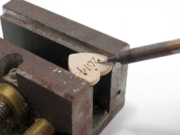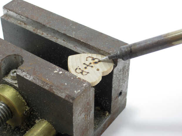 Utilizar una estufa de leña, soldador u otra herramienta (como un láser de corte...) para grabar los corazones. Optamos por hacer nuestras iniciales en el frente y el año en la parte posterior.