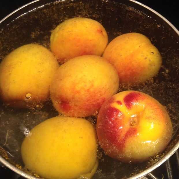 La forma más fácil de pelar melocotones es blanquearlos primero. Hervir una olla de agua caliente y añadir los melocotones durante 1 minuto, luego descarga los melocotones con agua fría.