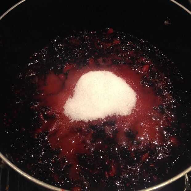 Lavar las bayas y luego puré, utilicé una trituradora de la patata, pero también funciona un procesador de alimentos (no quiero limpiarlo). Puré de bayas en el bote que lo planeado para cocinarlas, agregar el jugo de limón y azúcar antes de poner el calor a medio-alto.