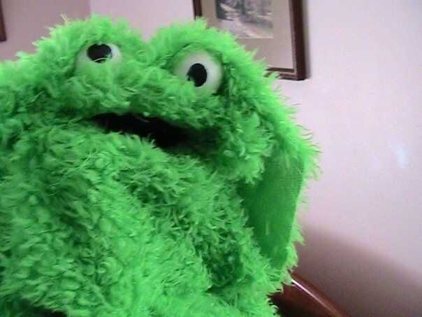 Si te fijas, te darás cuenta de que no se rellena la cabeza de Alfonso y que la manga de espalda se ha cosido en. La cabeza no es relleno porque proporcionalmente no tiene sentido y porque era mi primera marioneta, por lo que aún no había desarrollado la técnica. (Es verde).