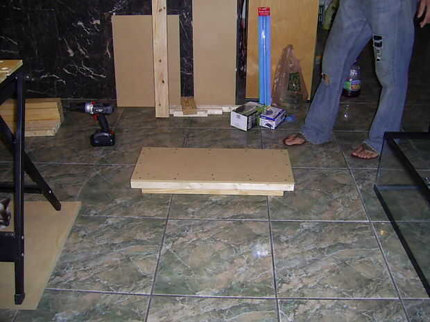 1. 1/2 tablero del MDF que yo había cortado a las dimensiones base exactas del exterior del tanque
