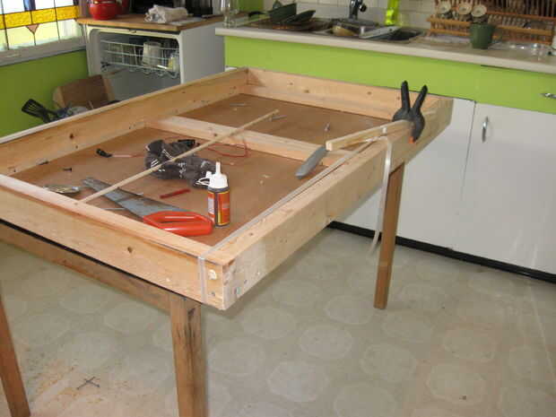 Suficiente sobre qué tipo de cristal, en el marco. Una de las maneras más fáciles de empezar es simplemente poner el vidrio sobre un nivel de suelo o trabajo superficial, establecen algunos relleno de algún tipo para proteger el vidrio, una toalla de playa funcionaría bien. Coloque la madera alrededor de la copa en forma de marco y marcar con un lápiz. La clave aquí es que un espacio de 2 mm entre la madera y el cristal lo más tarde que el vidrio se puede hacer para deslizarse dentro y fuera. Una vez medido y comprobado para asegurarse de que todo es kosher su leña. Usted debe tener 4 piezas, dos 2 x 4 a 84 cm de largo y dos 2 x 4 at122 cm largo. Mi truco para conectarlos es simple. Primero perfore agujeros para los tornillos que mantienen unida. Luego aplicar pegamento gorila a los bordes que se unió a "Asegúrese de humedecer los bordes con agua primero" luego que simple tornillo les juntos. Los tornillos proporcionan la presión de sujeción temporal. Espere un par de horas para el pegamento configurar disco duro, "curado total en 24 horas aunque". Una vez en configuración puede quitar los tornillos feos y utilice una broca de 3/8 para volver a perforar. Ir a través de una tabla en la otra al igual que los tornillos de madera a la profundidad de cerca de 4 pulgadas. Soplar hacia fuera cualquier serrín y prepárate tu espiga. Simple tenía un balde de agua que sumergió la punta el extremo de la espiga de 3/8 en a mojarlo previamente. Poner una cucharada digno de pegamento del gorila en un contenedor desechable y utilizarlo para su fuente de pegamento en vez de la botella para evitar cualquier contaminación de su botella de pegamento del gorila. Moje un palillo o un cepillo pequeño en el pegamento y pintar la punta de la clavija con el pegamento del gorila. introdúzcalo en el orificio y con un pequeño serrucho cortarlo al ras. Repita para el resto de los agujeros. Una vez seco, esta articulación es sólida como una roca!