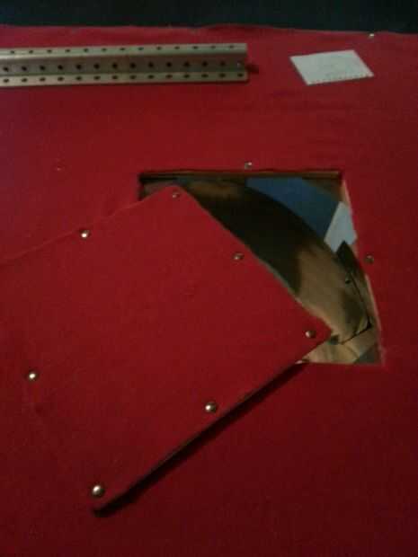 El primer paso en la construcción de la mesa es cortar un agujero en el centro de la misma. nuestro fue un 10" por 10" agujero. Este agujero es para que las piezas de mahjong caer a través. Mantenga el recorte de madera de 10 x 10 ya que será la tapa de la aleta más tarde.