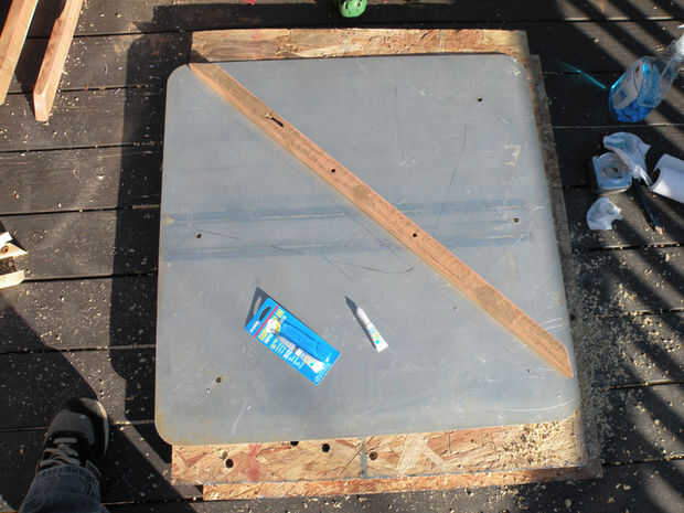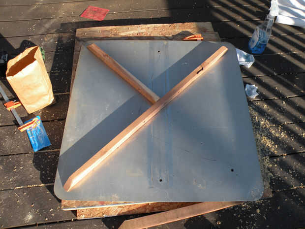 Una vez que dos piezas de igual corte y marque el centro en una corte la anchura de su correspondiente pieza de ella, así que tienes tres piezas para componer su "X". Perfore un agujero de 1/4" aproximadamente cuatro pulgadas desde el centro de la"X"en cada pieza, haciendo cuatro agujeros para las piernas de la bisagra. Liberalmente de arena, sello, si lo desea. Coloque las patas en la parte inferior de su mesa con superglue o abrazaderas para sujetar en su lugar temporalmente, luego perfore previamente y atornillarlas desde arriba. Si tu mesa no es metal y lo suficientemente espesa para tomar el tornillo de la parte inferior, usted puede atornillar desde abajo para mantener la superficie lisa.