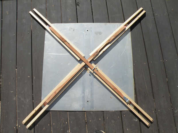 Taladre los agujeros en la parte superior de cada pata; primero un agujero contrataladrado para la tuerca y la arandela, luego un 1/4 agujero para el perno. El mismo maneras abajo de cada pata de la guarnición de cobre donde la ortesis de pierna finalmente bloqueará, de 4" por encima de los pies en este caso. La guarnición de cobre tiene que ser pasado donde el refuerzo de la "X" termina por lo que las piernas se pliega plana. Liberalmente de arena, sello, si lo desea.