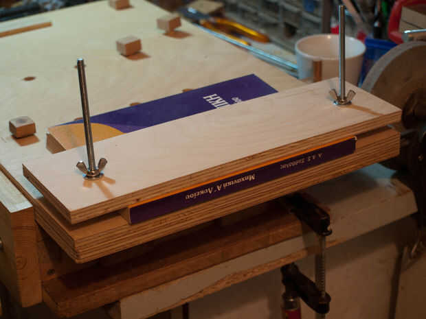 • Para la reparación de libros esto es una prensa pequeña conveniente que permite la correcta alineación. Más peso o abrazaderas incluso adicionales pueden agregarse o la parte superior de este.