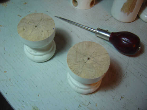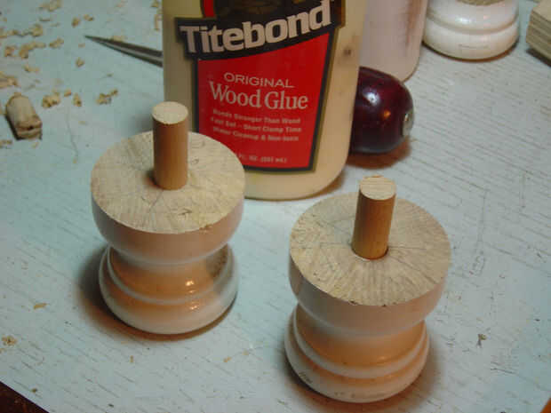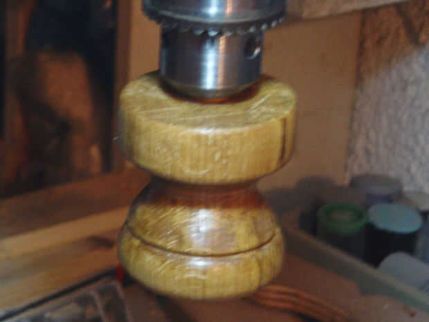Usé un pedazo de muebles que encontré. Contiene dos formas de "perilla" igual que recorte en una caja de ingletes, marcada los centros, perforados y aseguró las clavijas en ellos y luego arena en la prensa del taladro para recuperar la superficie de madera. Mientras que en el taladro cubre con barniz.
