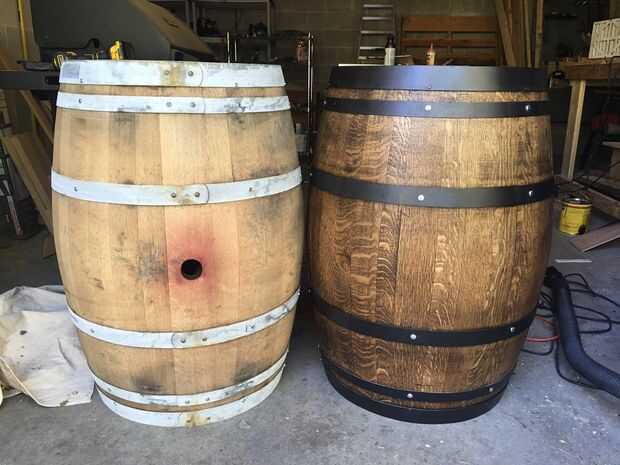 usted puede encontrar barriles de vino medio en muchas ferreterías y almacenes de jardinería (al menos en California) y utilizarlos para crear un lindo estante del vino y transportarlo fácilmente en el interior o al aire libre!En California, usted pu