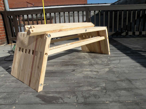 Lije las piezas del estante y deslícelos a través de. Ejecute una broca a través de los agujeros para conseguir todo a la línea, si es necesario. Añadir barras roscadas y apretar la articulación de la plataforma.