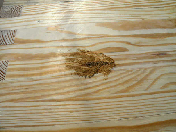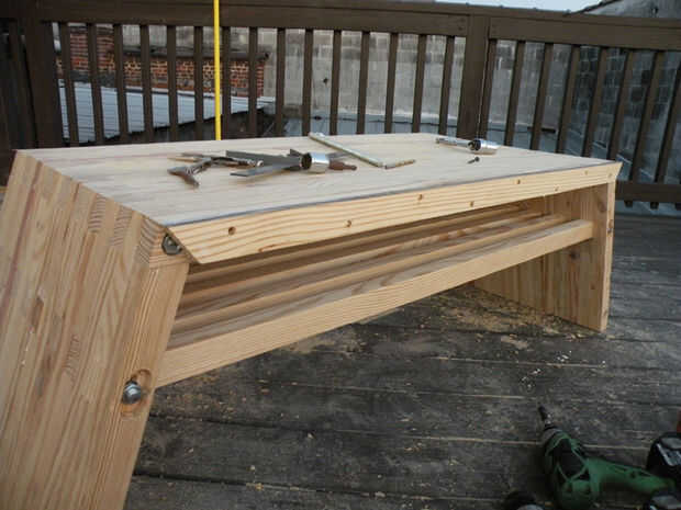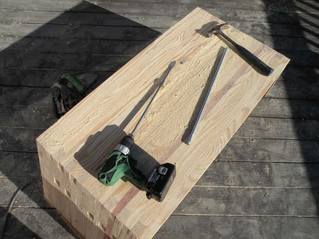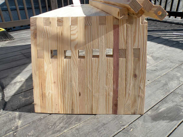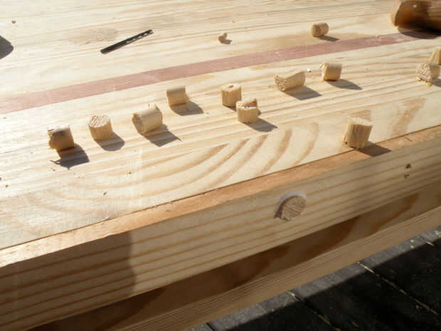 Taladro piloto y cajeado con agujeros de 1/2" en un patrón de zig-zag en las seis piezas de la cubierta a inglete. Pegamento y tornillos en su lugar para cubrir los extremos expuestos de las varillas roscadas. Llene los agujeros con tapones espiga pequeña, dejando orgullosos de la superficie del final por lo que puede lijar al ras.