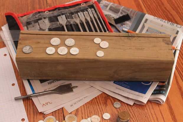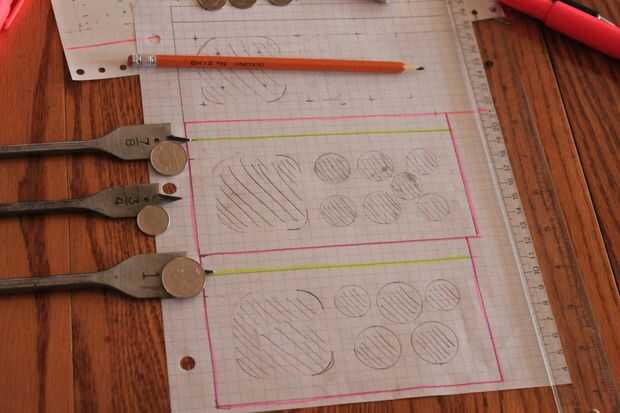 Tenga en cuenta como medida de los diferentes tamaños de agujeros. Hecho 3 bocetos sobre papel y le gustaba la última de ellas más. También planeo hacer un cubo grande, unos 2 x 2", muy opcional. También, una vez haya marcado los puntos y comenzó la perforación, sugeriría no taladrar todo el camino al principio. Esté la broca lo suficiente a la madera de la impresión y me dejan una idea de lo que la pone fuera mirada como.