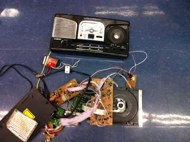 Con el tocadiscos, lo único que necesita son la plataforma de giro, el motor conectado a ella y a la base que se utilizará para sostener todo junto con el uso de tornillos y tuercas. Todo lo demás, como el frente de los tocadiscos con altavoz, botones, la alimentación inicial, unidad de CD y todo otro componente no se utilizará.