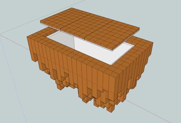 Me puse a trabajar en SketchUp para modelar la siguiente mesa. Planeé utilizar 2 "x 2" tablas de pino de Home Depot en diferentes longitudes para realizar una mesa de centro de veta con una nivel superior pero una inferior al azar, bajo-res-estalactita-mirando. Decidí ocultar un compartimiento entre las piezas verticales de madera, tanto para hacer el diseño más ligero, y como almacenamiento extra es siempre agradable. Las tapas del compartimiento fueron diseñadas para mimetizarse con el sobre que todo la mirada de la mesa para que se muestre sólido a las personas no en el saber.