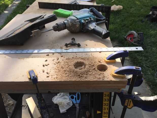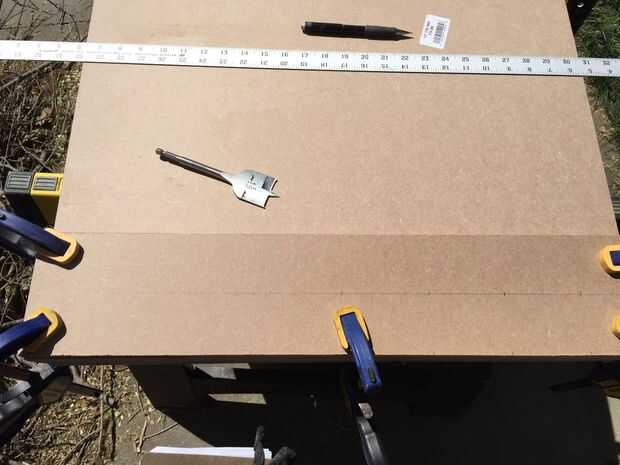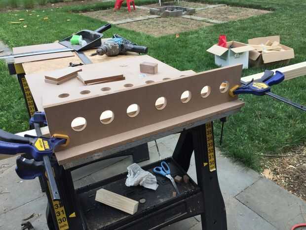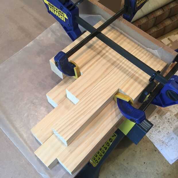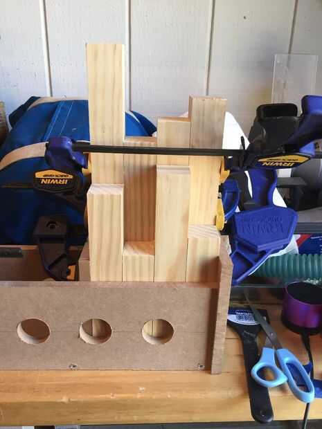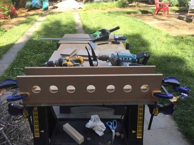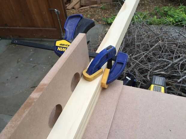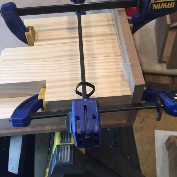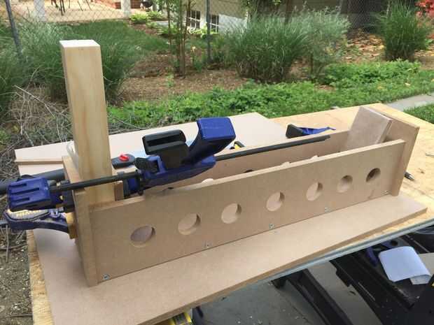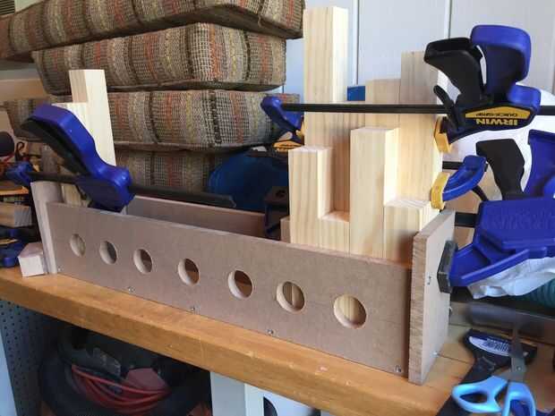 Me di cuenta de que necesitaría una plantilla o dos para agilizar el proceso de encolado. La primera plantilla fue creada para pegar las filas (dobles) exterior. Acabo de hacer un cuadro simple y largo que era sólo lo suficientemente ancho como para unir dos tableros. Taladré orificios de 1-1/2" a lo largo de la longitud de la cabeza de mis pinzas (resulta que desperdicié un tiempo unos agujeros que mi abrazaderas no eran lo suficientemente largos para llegar, tomar nota de esto).