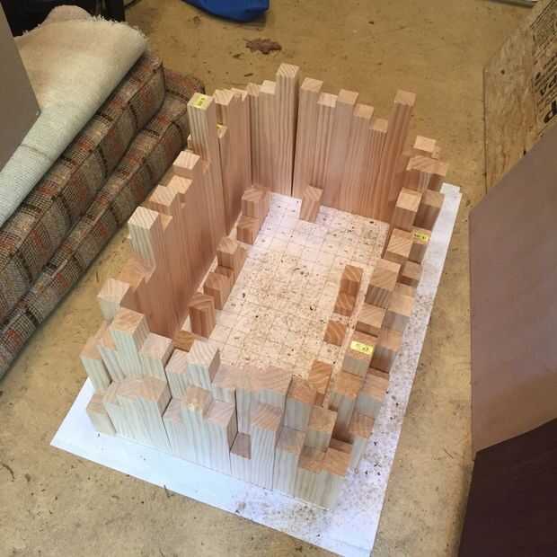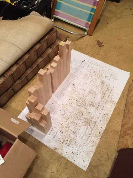 Me desplegó mi esquema en el piso de la tienda y empecé a diseñar mis tarjetas. Decidí organizar la veta para que hizo una especie de patrón de chevron. Doble comprobé la longitud de cada pieza y eligió la mejor orientación como puse, luego nuevamente comprobé que ambas de estas cualidades como pegué pares. Utilicé papel de cera para proteger a mi plantilla de squeeze-out. Entonces pegué conjuntos de dos pares juntos. Hice unos conjuntos de tres pares, pero se dio cuenta de que quería mantener a dos pares, que era un tamaño realizable a incluso hacia fuera con la chuleta de la sierra.