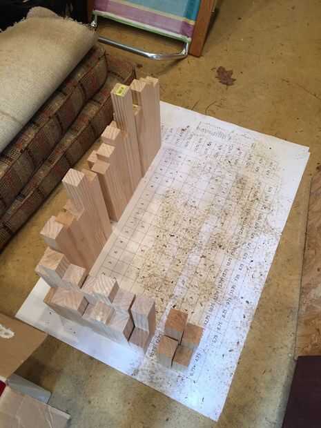 Esta parte es bastante autoexplicativo. Empecé con mis piezas de tamaño más grande y había trabajado mi manera hacia abajo. Me gusta utilizar cinta de pintor para marcar a una guía sobre la cerca de la Sierra de CP, así que puedo cortar un grupo entero después de medir sólo una vez. Tuve la intención de conseguir las piezas del perímetro cortadas primero, así que podría empezar pegando para arriba. Es posible optimizar el proceso de corte para reducir residuos de madera, lo hice sobre la marcha, así que tal vez no era la manera más eficiente. Cuando llegué hacia el extremo de una tabla, medir para ver si era lo suficientemente larga para contribuir al conjunto de longitud que estaba trabajando. Si no fuera así, examinó si podría conseguir dos trozos pequeños de mi lista fuera de él. Conservé los pilotes de pino cortado en paquetes etiquetados para hacer más rápido el paso de diseño.