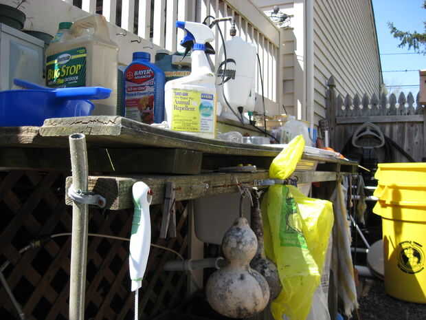 He apoyado con soportes "L" y 2 x 4 para las piernas. Conectado la llave de agua a mi grifo al aire libre con una manguera de la lavadora y un adaptador. El desagüe era (y sigue siendo) enganchado hasta la cubeta de drenaje francés.