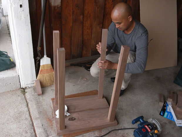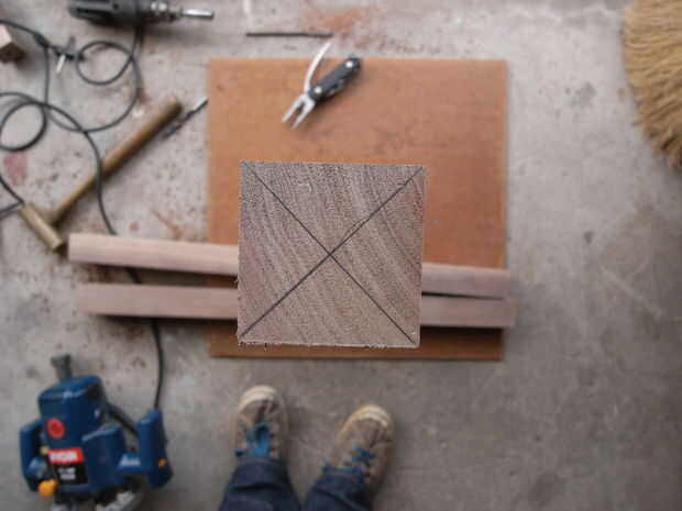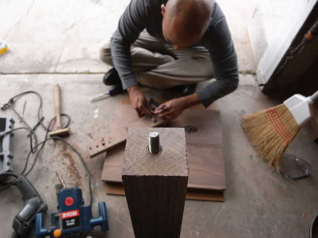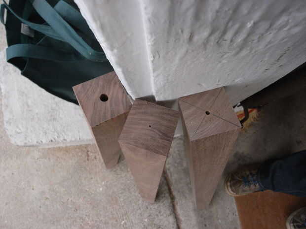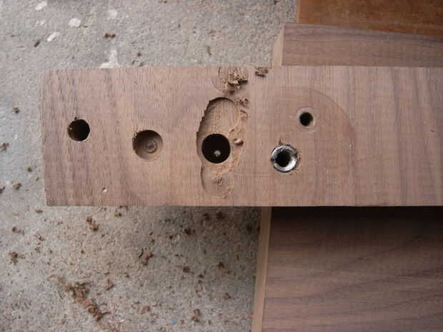 A continuación desea conducir que el hangar los pernos en las patas. Primero marque el centro de las piernas, luego taladre un agujero. Desea perforar un agujero del tamaño adecuado para el perno, pero no quiere destacar la madera demasiado, por lo que debe ampliar el agujero en etapas. Se utilizaron tres etapas. Para taladrar el tornillo en la pierna, puede pegarse una tuerca en un lado y luego use un accesorio de enchufe para el taladro.