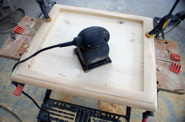 a continuación lija el acabado viejo de la tapa restante y los bordes con la lijadora de Palma con lija 150 esperé hasta después de la encaminamiento de la arena hacia fuera del centro para evitar rayar la madera desnuda con la base de la fresadora. Porque pino blanco es una madera tan suave, que tuve que tener cuidado de no lejos de la arena más que el acabado.