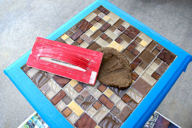 Después de la segunda capa de poliuretano totalmente seca protegido otra vez con cinta de enmascarar azul (baja de remate). (Dry grout es difícil de eliminar de la madera). 'Guante-up' en este punto porque los materiales en la lechada comen su carne. Usé aproximadamente dos tazas (16 onzas) de lechada seca y mezclar poco a poco en aproximadamente 4 onzas de agua. La lechada debe ser bien mezclada, (5-10 minutos). La proporción de mezcla de lechada/agua es correcta cuando la lechada es la consistencia de crema batida y 'picos'. Deje que la mezcla de lechada a saciar (permite que absorba bien el agua) por 10 minutos y agitar nuevamente durante otros 5 minutos. Usted puede comprar lechada premezclada; ¿un cuarto de galón habría sido más que suficiente para este proyecto, pero qué divertido es? Mezcla de la lechada fuera porque el polvo de cemento de la lechada seca va a todas partes. Evite respirar el polvo. Cuando grandes cantidades de lechada de la mezcla, se recomienda una máscara de filtro de papel.