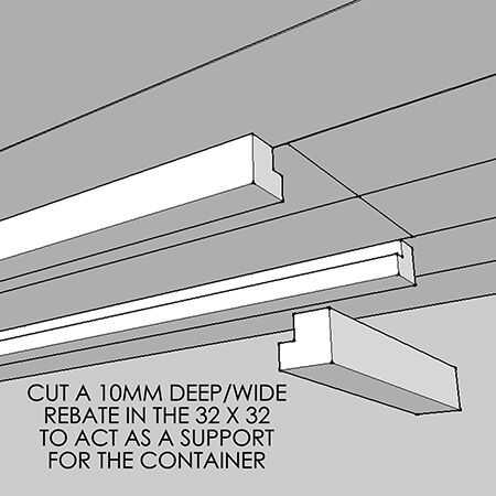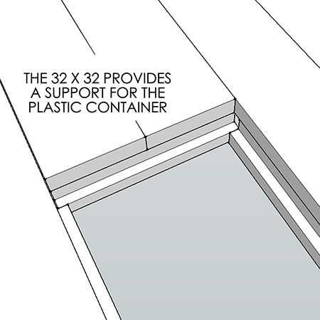 6. el siguiente paso consiste en agregar un marco de soporte para el contenedor de plástico (planta). Como se mencionó anteriormente, si usted es incapaz de un contenedor que es del mismo tamaño de la fuente puede modificar los listones dos centro o cambiar el tamaño de los soportes que sujetan el contenedor. Para hacer el bastidor de soporte utilizando el pino de 32 x 32mm usé mi mesa de la fresadora para cortar un descuento que es igual de alto y ancho como la parte superior del envase plástico. Esto permitirá que el contenedor a hundirse debajo de la superficie de la mesa y colocar la tapa en la parte superior.