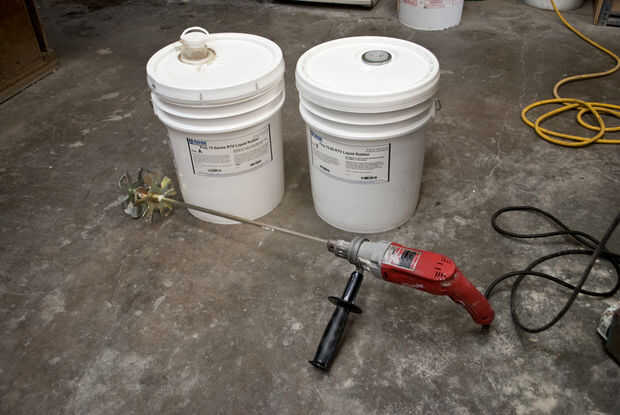 Mezclar parte A y parte B usando el taladro con cable. Raspe los lados y la parte inferior de la cubeta con la espátula y siga batiendo por unos minutos.