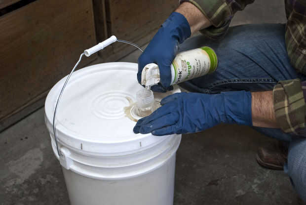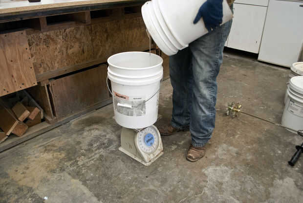 Parte A y parte B en primer lugar se mezclan en un balde de 5 galones (blanco en las fotos). Luego se transfieren a un segundo balde de 5 galones (gris en las fotos). Una manera de asegurarse de que no mezclar material entra en la forma final es utilizar la técnica de mezcla doble cubo.