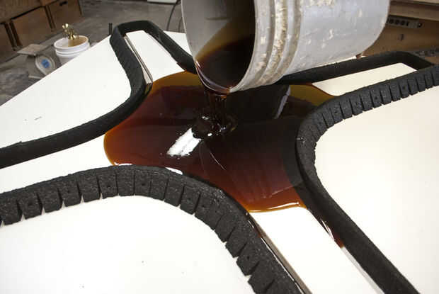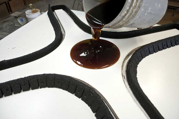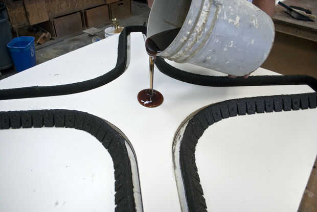 Echar de un lugar y dejarlo fluir hacia el exterior. Verter de múltiples lugares va a crear las burbujas de aire. Use una espátula para mover la goma en los bordes de la forma. Todo el tiempo, está tratando de no crear burbujas de aire extra, así que trate de reducir al mínimo cualquier movimiento turbulento. El espesor total de este molde es 1", con aproximadamente 1/4" cubriendo el positivo. Buscar posibles burbujas de aire grandes que llegan a la superficie y utilice la espátula para arrastrar hacia arriba y reventarlas.