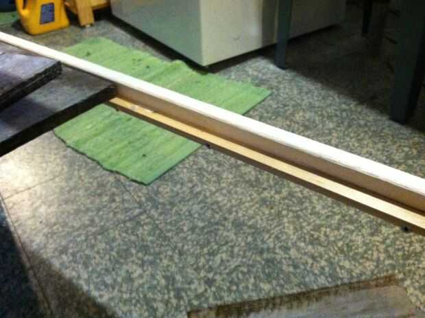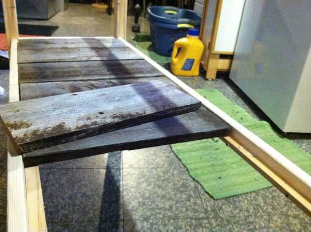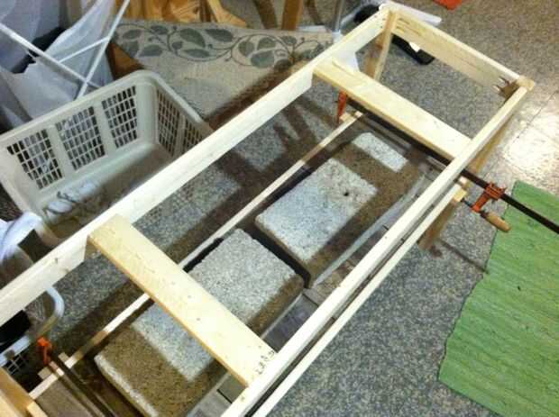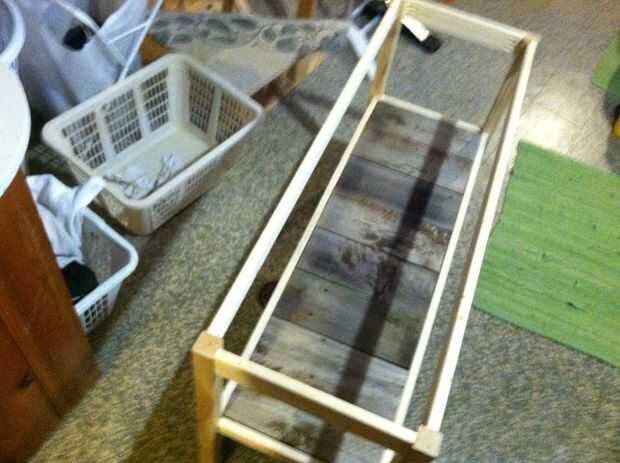 Salvado mi vieja juntas cerca para hacer el estante inferior. Se puede utilizar una pieza de madera contrachapada o varios trozos cortados a la medida. Sólo asegúrese de que las abrazaderas se fijan a la altura correcta para hacer todo al ras. Pegué mis tablones listones y delantal y pesas y pinzas para asegurar un enlace apretado.