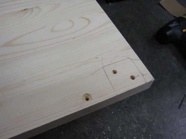 Una vez que se ha hecho, se basaba mi desktop en las piernas del deslizador (y sus soportes de estante adjunto), luego trazó el contorno de las patas de control deslizante en la parte inferior del escritorio.