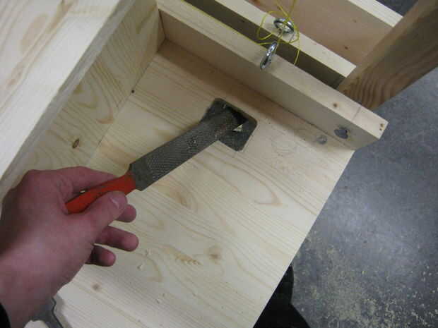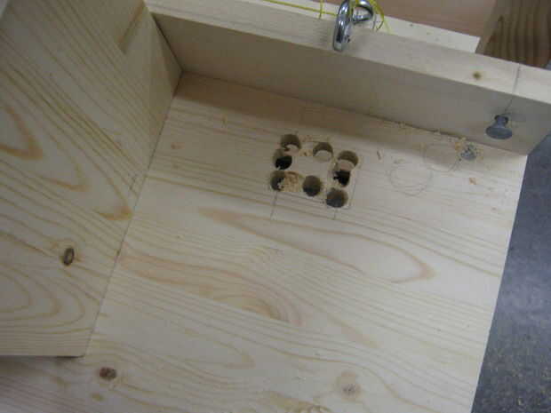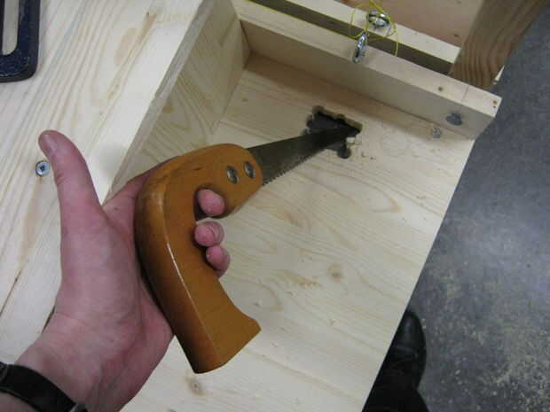 Para hacer el agujero, perforar orificios grandes alrededor del perímetro de la zona quería golpear, luego había aserrado entre ellos y finalmente ante el agujero en forma de una escofina muy áspera, luego había alisado hacia fuera.