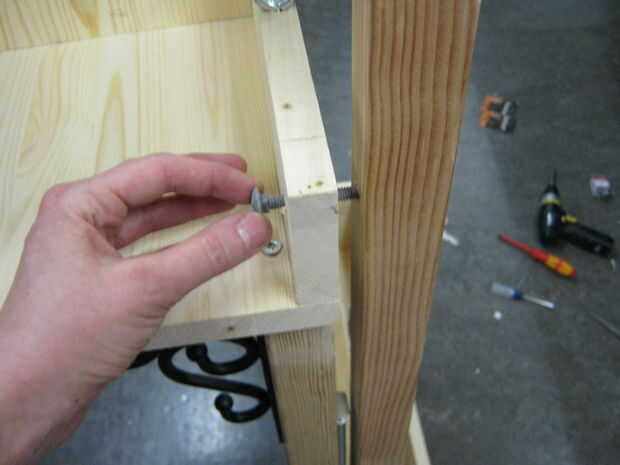 También perforé los agujeros así que puedo bloquear el escritorio en su lugar a sus dos posiciones. Un par de los pernos de carruaje (con las roscas con cinta scotch sobre) actúan como mis pasadores por ahora.