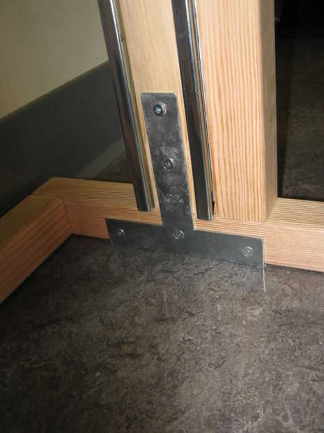 También es útil: puse un T-brace en el cruce entre los montantes y las patas de apoyo horizontal, abajo en el piso. Adición de este refuerzo adicional es importante porque esa articulación será susceptible a daños. Los montantes llevan todo el peso de su escritorio y contrapeso, así que cada vez que tambalee, ejercen un esfuerzo de torsión grande en esa articulación. Ya que la L-brackets en el camino de las correderas en los montantes, tenemos brackets T-en su lugar. Sólo usé uno por la pierna, pero podrias poner uno a cada lado de ambas piernas para la fuerza agregada.