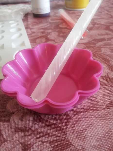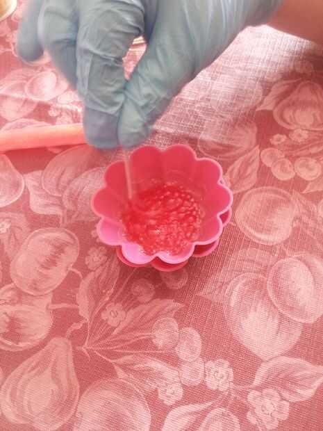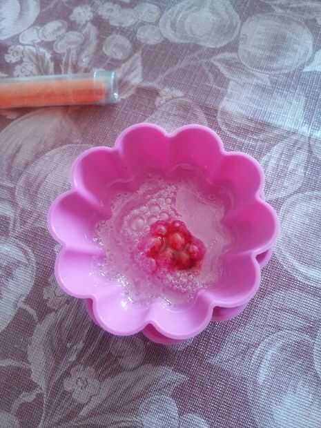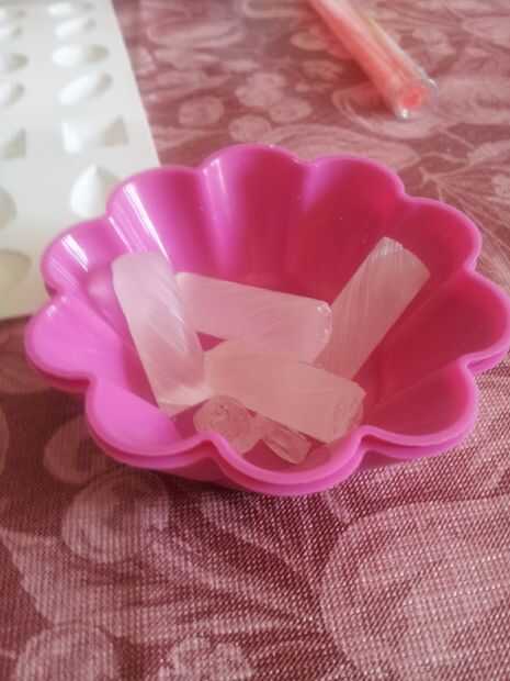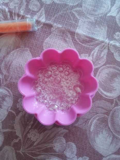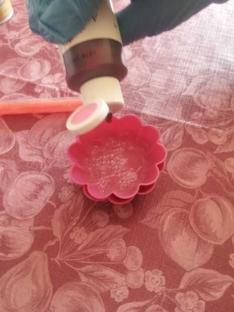 Seguridad en primer lugar, pone en los guantes de algodón luego los guantes sin látex. Tomar el palo de isomalt y romper en su recipiente de silicona. El microondas lo para unos 30 - 60 segundos. (mina solo dura 30 seg.) El palo debe estar totalmente derretida y muy burbujeante. Si tienes los palos blancos o claro y deseo de colorearlos, hacerlo ahora. Utilizar alimentos gel color. Use un palillo para mezclar bien. Sólo necesitas un poquito, sobre todo si quieres que sea agradable y claro.