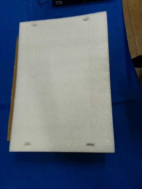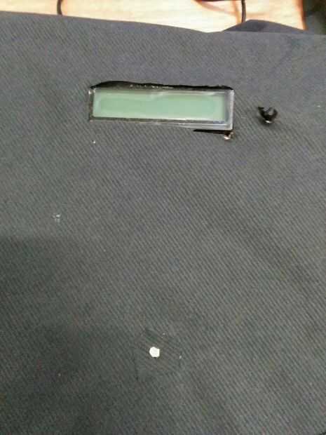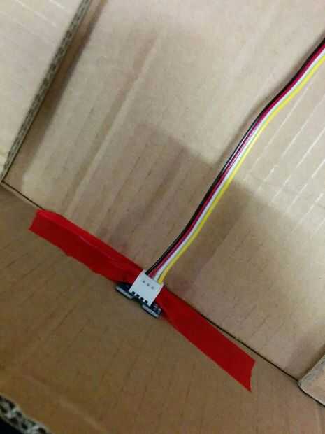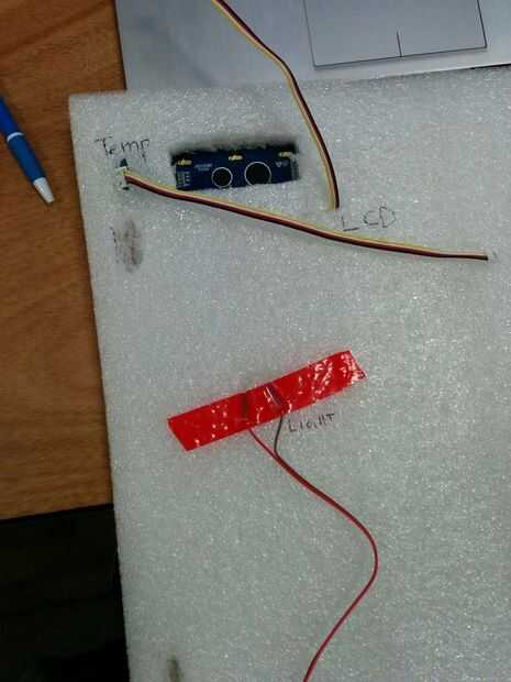 Entonces nosotros con cable la caja, los sensores de IR a los lados, la pantalla LCD y sensor de ángulo rotativo entre el cartón y la hoja del poliestireno en la parte superior. Lo mismo para los LEDs y el sensor de luz.