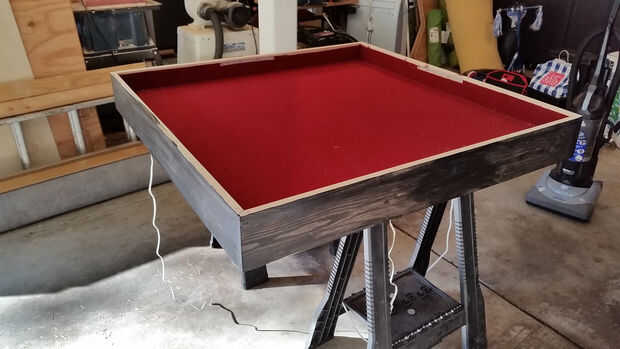 Te recomiendo descargar Sketchup y busca en el archivo para mostrar cómo la tabla viene juntos. Básicamente se trata de un cuadrado de madera cubierto de fieltro, en ranuras routered en 1 x 6' paneles que envuelven alrededor de él, y con un descanso de brazo de 2 x 4 que figuran en el acolchado y falso cuero.