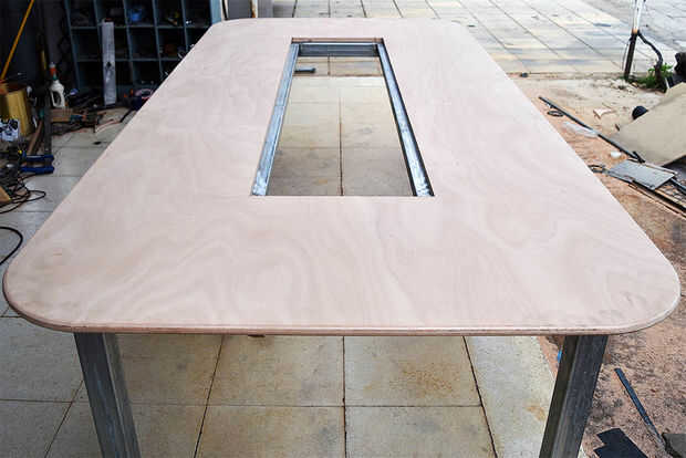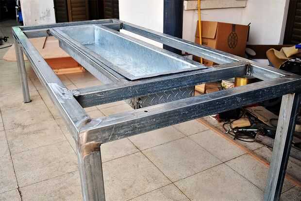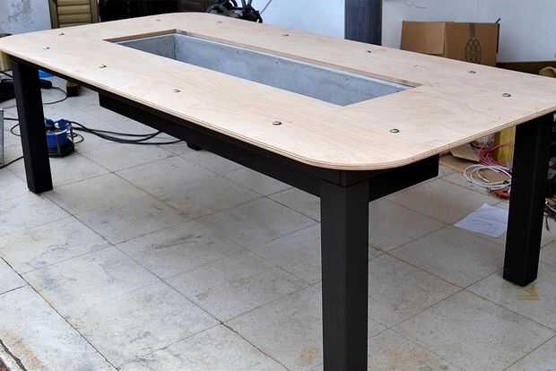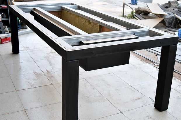 Hemos hecho un marco metálico con una hueca cuadrado sección conocida como Plaza de tubos de 60 mm x 60 mm, longitud de 220 cm y 100 cm de ancho con cuatro patas 73 cm de altura. En el punto central de este marco, se realizó una toma para colocar la barbacoa. Entonces, la superficie superior entera del marco fue alineada con el tablero del cemento que se utiliza para seguridad contra incendios. Con respecto a la superficie final de la tabla, hemos utilizado madera contrachapada marina que es resistente al agua, así como el marco del resto, hemos utilizado el mismo tipo de madera. En el punto central debajo de la mesa, se hizo una caja de madera que cubre la barbacoa con el fin de proteger al usuario de las altas temperaturas que se están aumentadas. Así, para aumentar el rendimiento de nuestra estructura y para proteger esta caja de madera, que nos forramos el lado interno de la caja con lana de roca, que es el material aislante de calor y luego también colocamos el tablero del cemento de seguridad contra incendios.