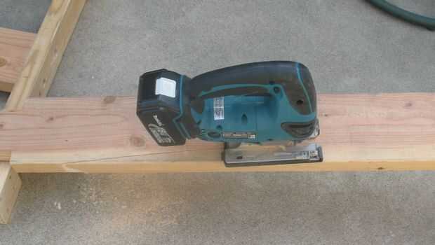Para cortar las espigas en la camilla, medimos 3 pulgadas desde el extremo, y 1 pulgada en los lados. Cortamos con una sierra de sable, pero funciona cualquier tipo de Sierra