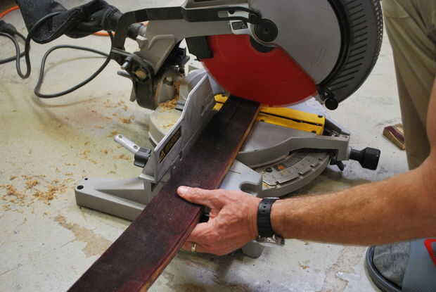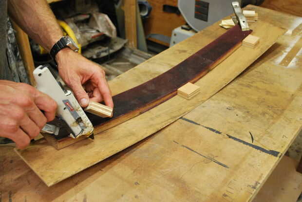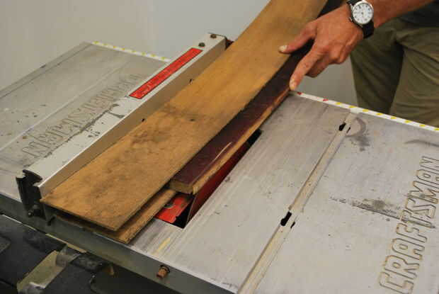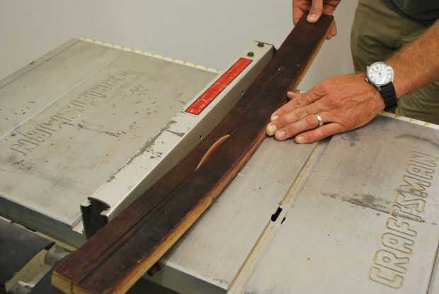 Cada duela es un poco más ancha en el medio, así tienen ser componentes especiales. Monte una plantilla sencilla para mantenerlas rectas en la mesa. Después de tener cortado un lado, Monte la guía de la sierra y corté las duelas en tablillas de 1" de ancho.