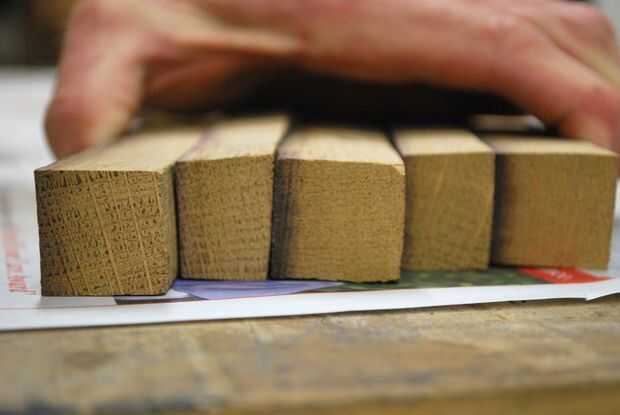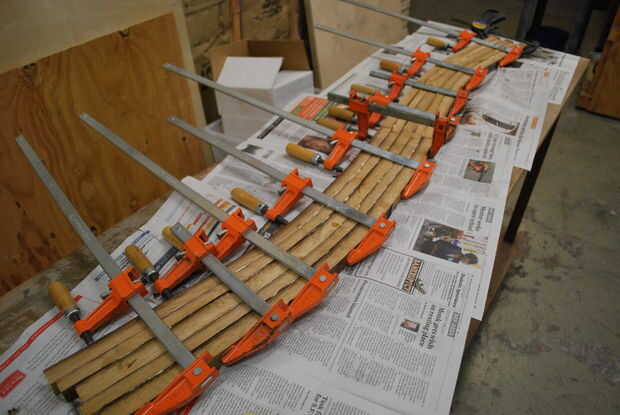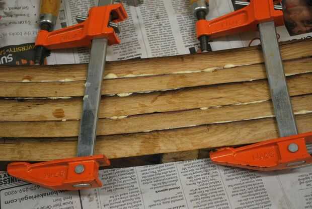 El pegado de las duelas bajo paciencia, ya las piezas pueden ser irregulares. Encontré que 5 es un buen número para empezar. El medio del tablero, donde las dos mitades se reúnen--aquí las piezas tienen ser del mismo ancho, y el conjunto tiene ser bien apretado para que no haya deformaciones en la forma. El pegado tiene que tan preciso como sea posible, pero al fin y al cabo es como operar en una albóndiga.