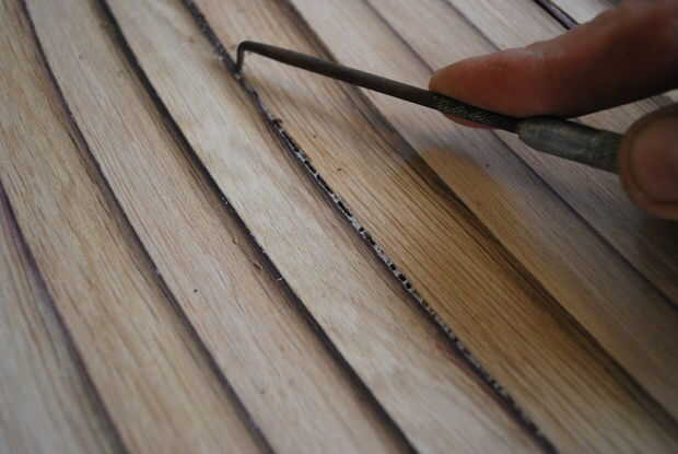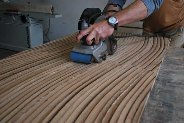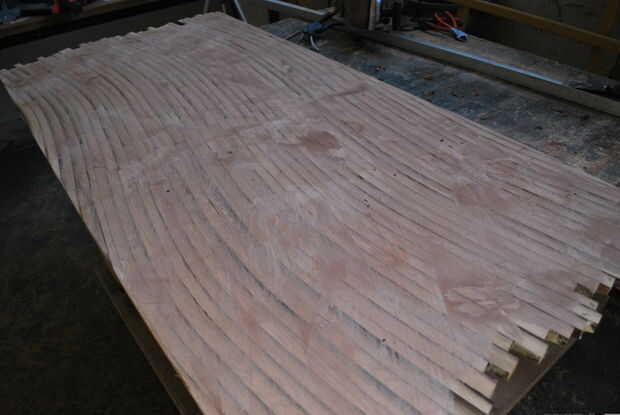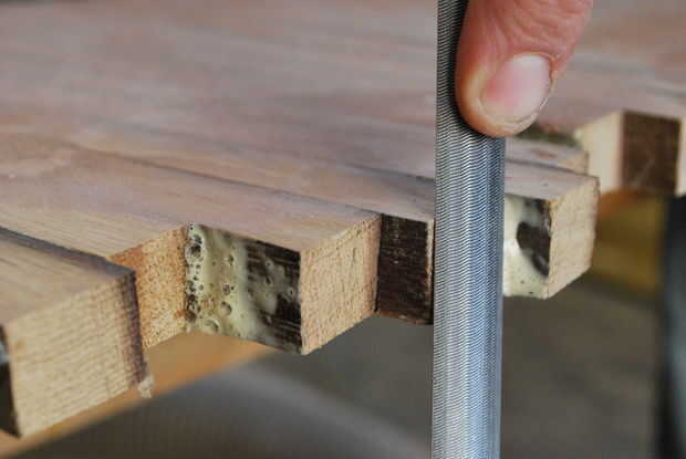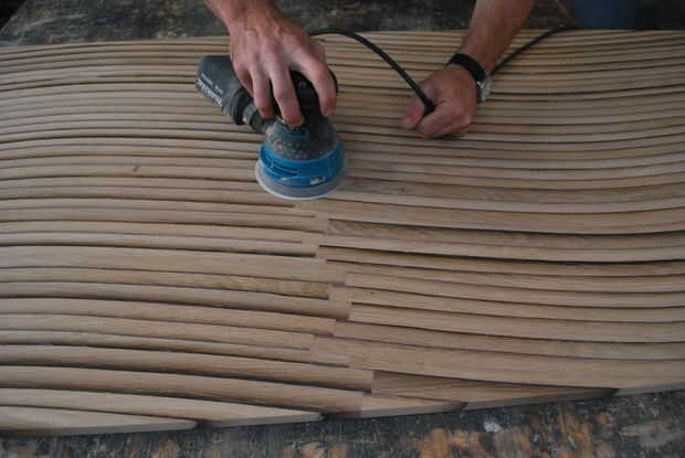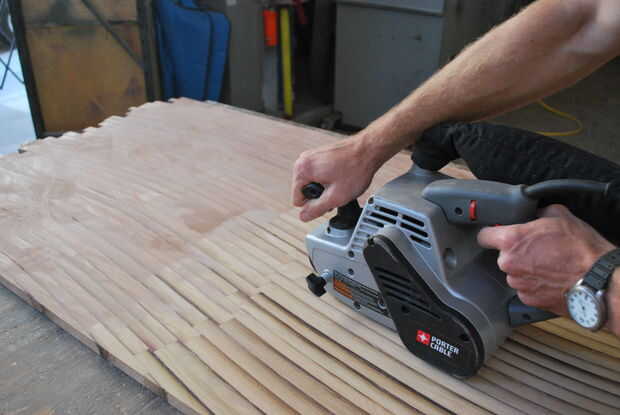 Aplana la cara superior del tablero con una lijadora de banda. Usé papel de grano 40 80:-->-->--> 120. En las franjas, quita el pegamento de las grietas/huecos donde no haya una unión fuerte. Los vas a rellenar.